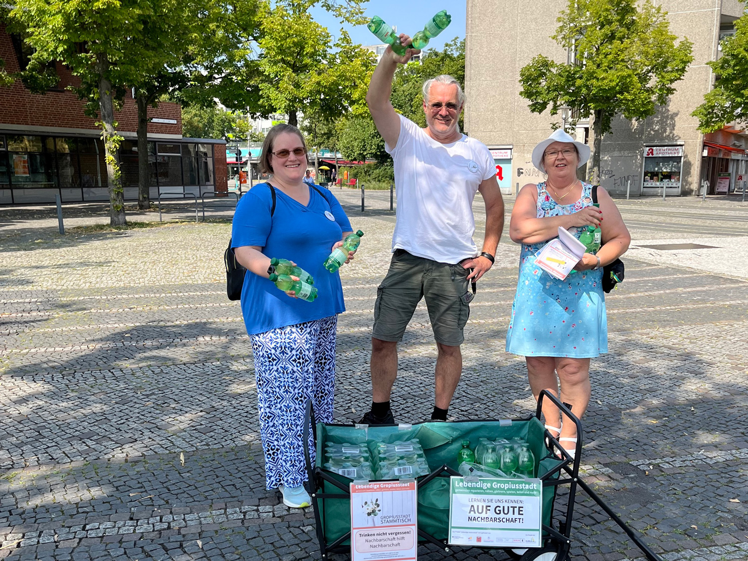 Das wurde auch kurz nach Projektstart gleich sichtbar, als Mitglieder des Stammtischs (Lebendige) Gropiusstadt und Quartiersräte an den Hitzetagen in der vergangenen Woche auf dem aufgeheizten Lipschitzplatz kostenlos Mineralwasser verteilten. Eine kleine Geste mit großer Wirkung für die Nachbarschaft!
